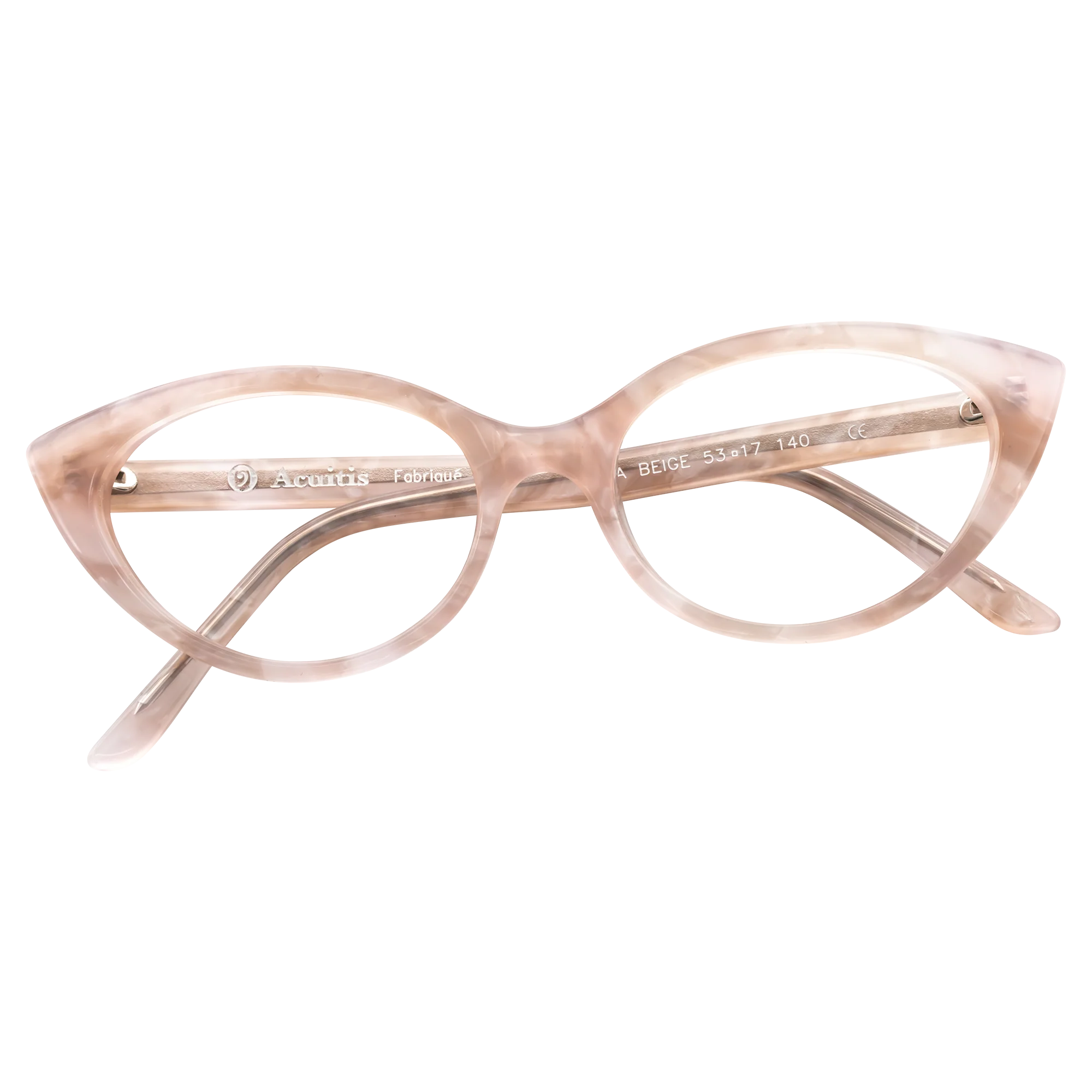 Monture femme en fleur de coton, de forme oeil de chat et montée de branches en acétate. Monture fabriquée en France dans notre manufacture de Nantes, avec un polissage et un montage fait main.