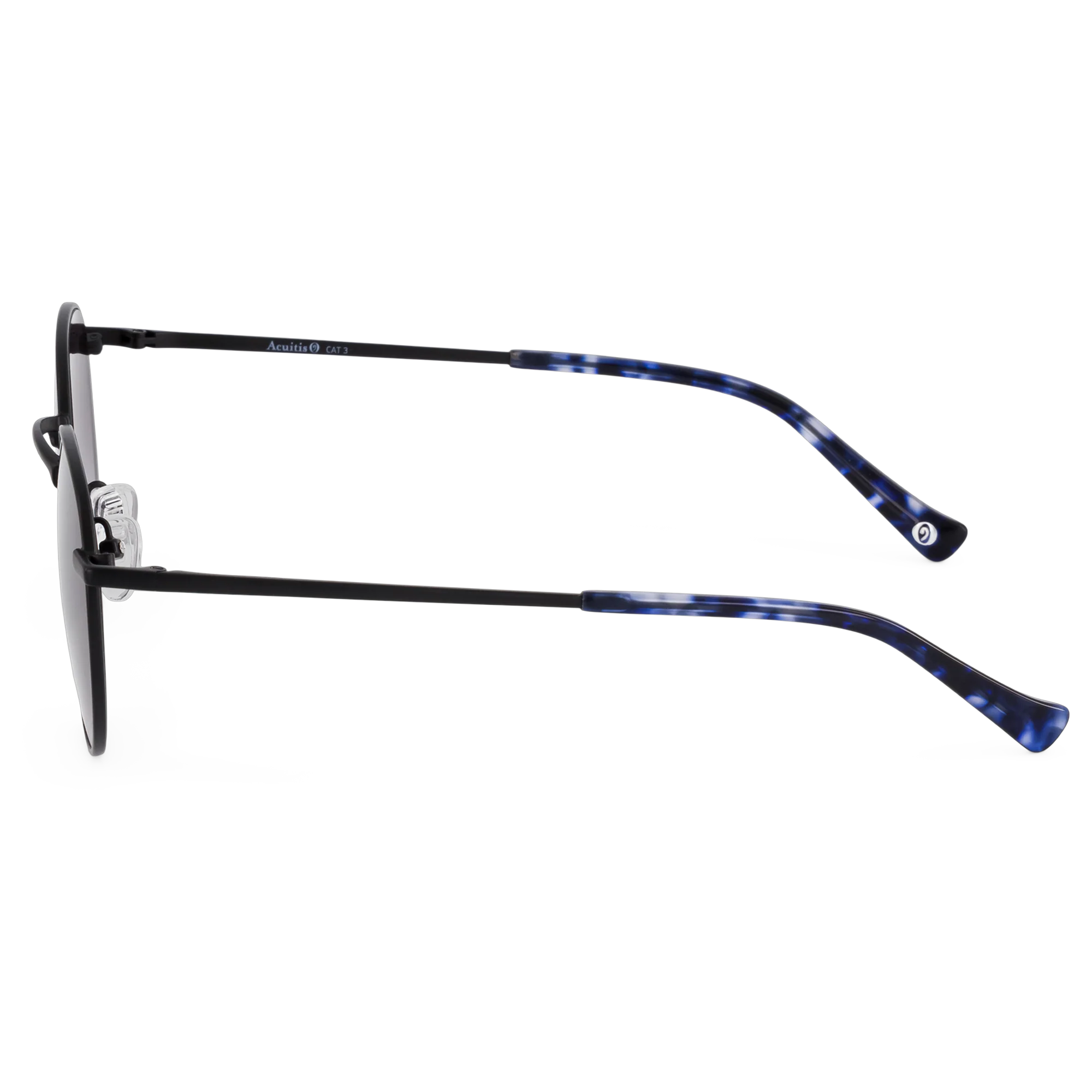 Une monture pantos à l’allure légèrement rétro, travaillée dans des coloris métalliques élégants (doré, argenté, noir et autres nuances discrètes). Les manchons en écailles et les verres teintés renforcent le jeu de contraste et de caractère. Une solaire sobre mais expressive, alliant féminité et intemporalité.
